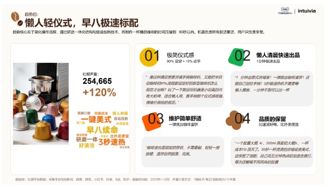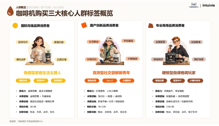 高效型社交尝鲜新青年是国产创新品牌的主力军。他们的决策逻辑是性价比优先,其次是颜值和易用性。咖啡不仅是日常提神饮品,更是社交货币。他们偏好制冰、冷奶泡、双豆仓等功能模块,追求的是日常生活节奏中的小确幸和生活里的一点甜。