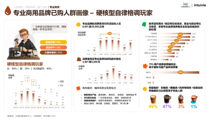 硬核型自律格调玩家是专业商用品牌的核心购买人群。他们的决策逻辑围绕配置性能和系统完整度展开。咖啡是自律生活方式的一部分,常在运动健身时饮用。他们偏好制冰、多饮品、电子手冲等功能,追求的是对咖啡风味的精准掌控和完整的家庭咖啡系统搭建。