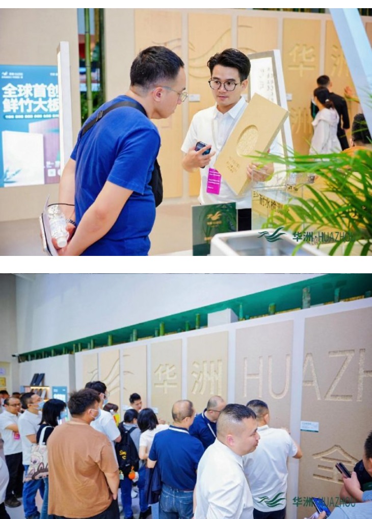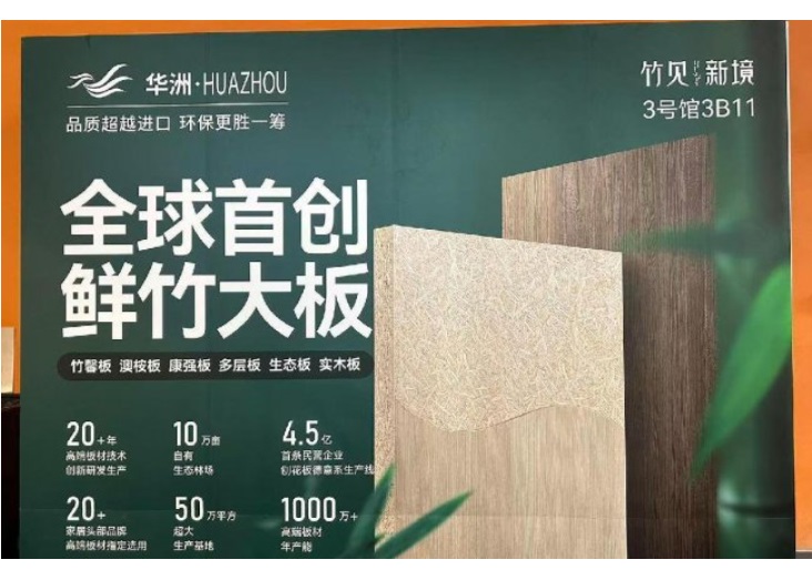 作为深耕板材领域28年的老牌企业,华洲木业此次参展精准贴合行业绿色环保、多元创新的发展导向,以“竹见新境”为核心主题,携全球首创竹馨板、金品澳桉板等七大核心系列惊艳亮相,将东方竹韵与现代家居科技完美融合,为现场观众带来了一场沉浸式的绿色家居体验。展厅设计巧妙融入原竹、竹制品、竹文化等东方元素,搭配天然鲜竹大板,让来访者在近距离感受产品质感的同时,深刻体会“以竹代木”的生态魅力,传递出品牌践行绿色低碳发展的坚定理念。